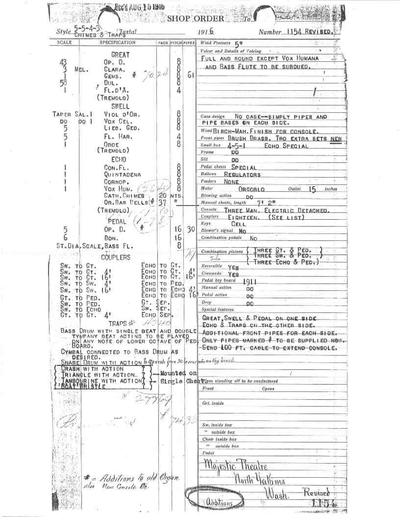 Great 8 Open Diapason 8 Clarabella 8 Gemshorn 8 Dulciana 4 Flute d'Amour Tremolo Sw to Gt 16-8-4 Echo to Gt 16-8-4 Gt to Gt 4 Gt Unison Sep. Swell 8 Lieblich Gedeckt 8 Viol d'Orchestra 8 Vox Celeste 4 Harmonic Flute 8 Oboe Tremolo Sw to Sw 16-4 Swell Unison Sep. Echo 8 Concert Flute 8 Quintadena 8 Cornopean 8 Vox Humana Tremolo Cathederal Chimes Or. Bar Bells Echo to Echo 16-8-4 Sw to Echo Echo Unison Sep. Pedal 16 Open Diapason 16 Bourdon 8 Bass Flute Gt to Ped Sw to Ped Echo to Ped Traps Bass Drum with single beat and double tympany beat actions to be